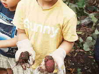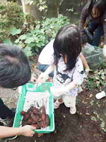 5月に植えたサツマイモの収穫をしました。蔓を辿って根元から引き抜き,芋を掘り出しました。可愛い芋から丸々とした芋まで収穫できました。