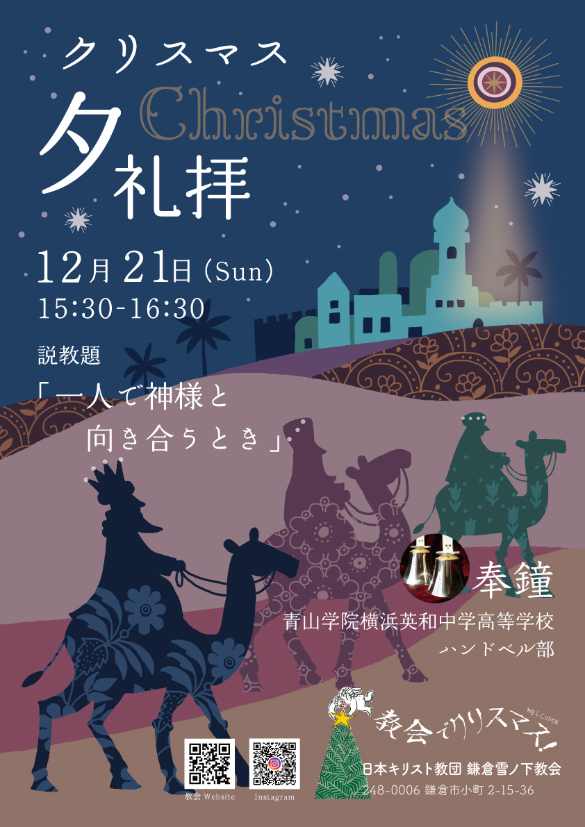 2025年12月21日 クリスマス夕礼拝 2025.11.10 クリスマス夕礼拝 12月21日(日) 15:30〜16:30 説教「一人で神様に向き合う時」 ハンドベル奉鐘 青山学院横浜英和中学高等学校ハンドベル部 Post Share LINE note 11月23日(日) 伝道礼拝 2025年 教会学校クリスマス|こどもクリスマス 新着記事 お知らせ一覧 2025.11.16 2025年 鎌倉雪ノ下教会 クリスマスのご案内 2025.11.16 2025年12月 主日礼拝・集会の予定について 2025.11.15 2025年11月 主日礼拝・集会の予定について 2025.11.10 2025年 教会学校クリスマス|こどもクリスマス 2025.10.18 11月23日(日) 伝道礼拝